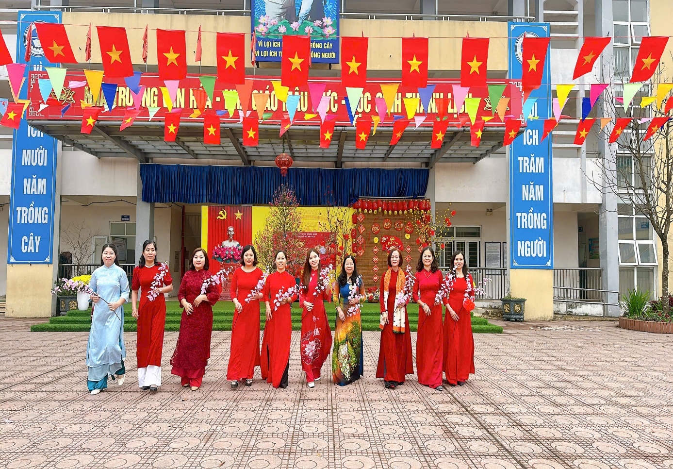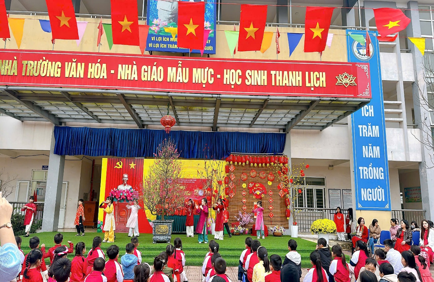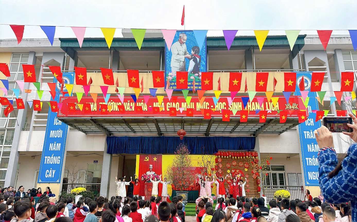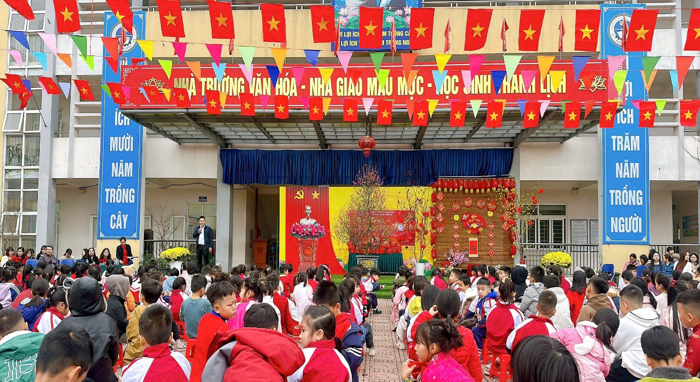 Ngay từ sáng sớm, sân trường đã khoác lên mình diện mạo rực rỡ với cờ hoa, băng rôn, khẩu hiệu chào xuân. Không khí náo nức, tươi vui hiện rõ trên gương mặt của 936 em học sinh thân yêu. Tham dự chương trình có ông Nguyễn Đức Đỉnh – Trưởng Ban Đại diện CMHS trường, ông Nguyễn Văn Trung – Phó Ban, cùng các thầy cô trong Ban Giám hiệu, tập thể cán bộ giáo viên, nhân viên nhà trường.