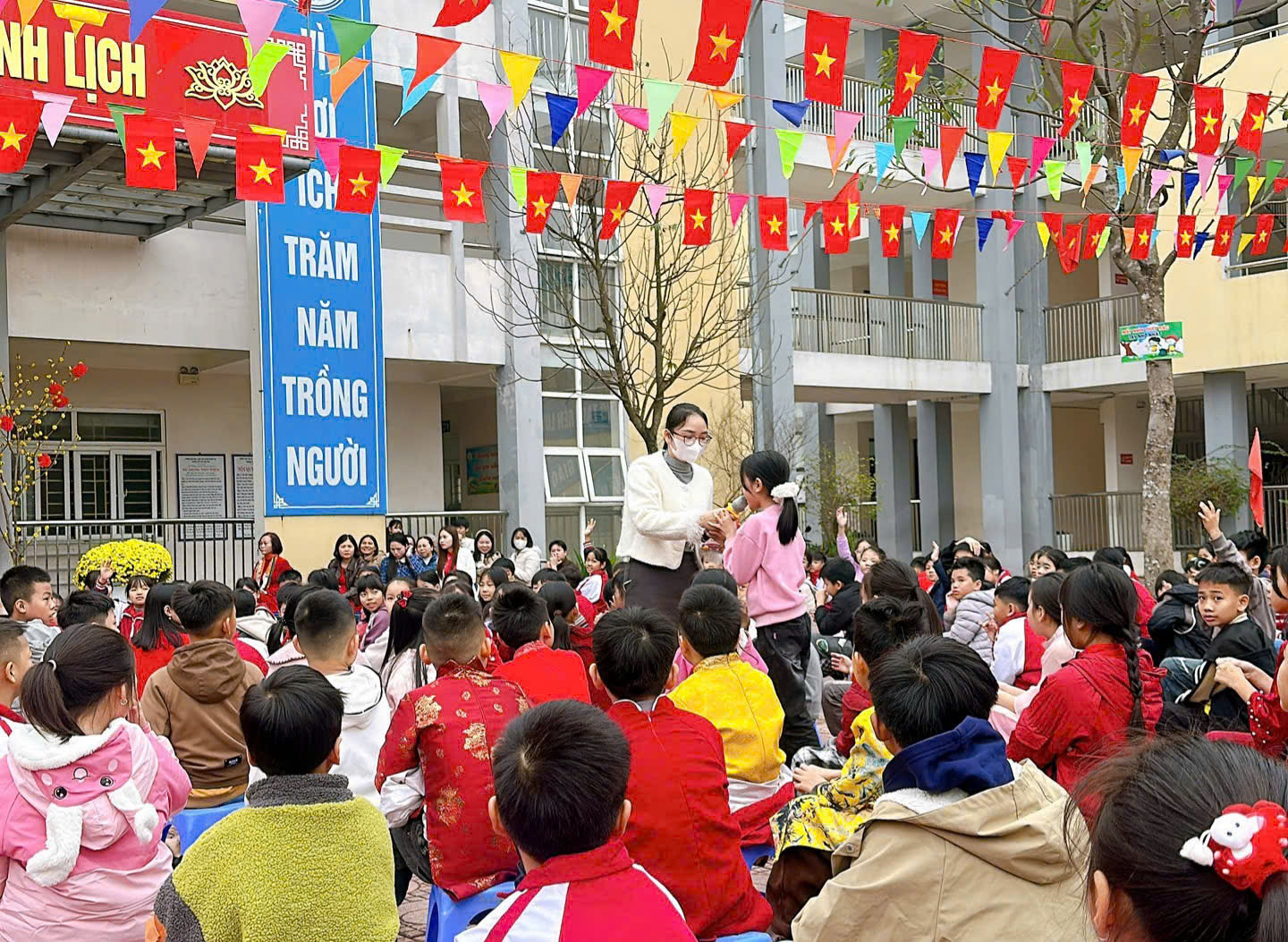 Phần đố vui có thưởng tiếp nối chương trình đã thu hút sự tham gia hào hứng của các em. Những câu hỏi về ngày Tết cổ truyền, về truyền thống dân tộc và mái trường thân yêu vừa giúp các em mở rộng hiểu biết, vừa tạo nên bầu không khí sôi nổi, gắn kết.