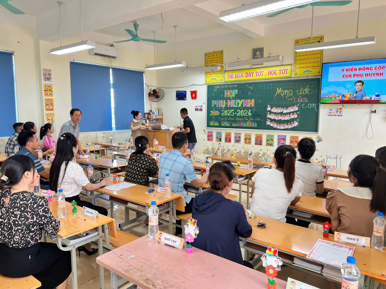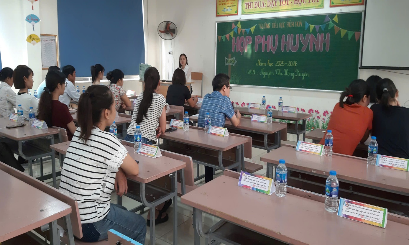 HỌP PHỤ HUYNH ĐẦU NĂM- KHƠI NGUỒN HẠNH PHÚC Chiều ngày 7/9/2025, trường Tiểu học Bích Hòa tổ chức Hội nghị cha mẹ học sinh đầu năm học. Đây là dịp quan trọng để nhà trường, giáo viên gặp gỡ phụ huynh học sinh thông báo kết quả đạt được trong năm học trước và triển khai phương hướng, nhiệm vụ trong năm học mới. Qua buổi họp giúp tăng cường sự phối hợp, gắn kết giữa gia đình và nhà trường nhằm nâng cao chất lượng giáo dục toàn diện cho học sinh. Các lớp chuẩn bị phòng họp Cha mẹ học sinh đầu năm Sự thành công của một đứa trẻ là sự kết hợp hoàn hảo giữa giáo dục gia đình và giáo dục nhà trường. Trong quá trình giáo dục một đứa trẻ không chỉ đơn thuần là thành tích và lên lớp, mà đó còn là cách mà người lớn tạo dựng một môi trường học tập để giúp trẻ trở thành con người tốt hơn và có nhiều hiểu biết về thế giới xung quanh. Để đảm bảo điều đó thì sự phối hợp hiệu quả giữa CMHS và giáo viên phải vô cùng chặt chẽ. Buổi họp phụ huynh đầu năm học là dịp quan trọng để giáo viên triển khai kế hoạch hoạt động trong cả năm học của học sinh tới phụ huynh, là dịp để giáo viên lắng nghe những chia sẻ từ phụ huynh về việc học của các con tại trường. Không những vậy buổi họp đầu năm còn là cơ hội để xây dựng mối quan hệ hợp tác, gắn bó và thân tình giữa gia đình và nhà trường, giữa cô giáo và các bậc cha mẹ học sinh. Để chuẩn bị tốt cho buổi họp, mỗi giáo viên chủ nhiệm của trường Tiểu học Bích Hòa đã thiết kế thư mời, in từng tên học sinh; vẽ bảng chào đón cha mẹ học sinh. Cuộc họp diễn ra sôi nổi với không khí thoải mái, thẳng thắn cùng nội dung của cuộc họp được chuẩn bị rất chu đáo. Với nhiều hình thức sáng tạo, độc đáo, cô đã giúp các em chia sẻ những tâm tư gửi gắm tới bố mẹ. Những hoạt động đó đã gắn kết tình cảm gia đình, bố mẹ thêm gần gũi, hiểu được những suy nghĩ và nguyện vọng của con. Nhiều phụ huynh đã rất xúc động khi viết những lời yêu thương cho các con trong tấm thiệp “Lời yêu thương”. Buổi họp phụ huynh của các lớp đã diễn ra thành công tốt đẹp. Với những hoạt động ý nghĩa đó, thay đổi hình thức thực hiện trao đổi làm cho buổi họp không nặng nề, khô khan. Sau buổi họp, nhà trường đã nhận được những lời chia sẻ, cảm ơn và trên hết là sự tin tưởng của các bậc phụ huynh. Cũng sau buổi họp ấy, phụ huynh thấy hiểu con mình hơn, hiểu mình cần làm gì để đồng hành cùng con trên chặng đường sắp tới. Với giáo viên, sự cảm thông, chia sẻ và đồng hành của phụ huynh luôn là niềm động lực giúp cho mỗi cô giáo tự tin hơn với con đường mà mình đã chọn. Chúng ta hãy cùng nhau tạo điều kiện tốt nhất để các em có môi trường học tập và phát triển toàn diện. Dưới đây là một số hình ảnh của buổi họp phụ huynh đầu năm