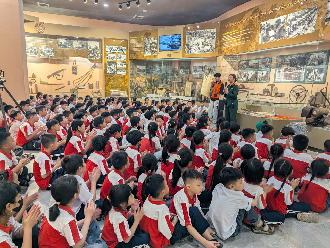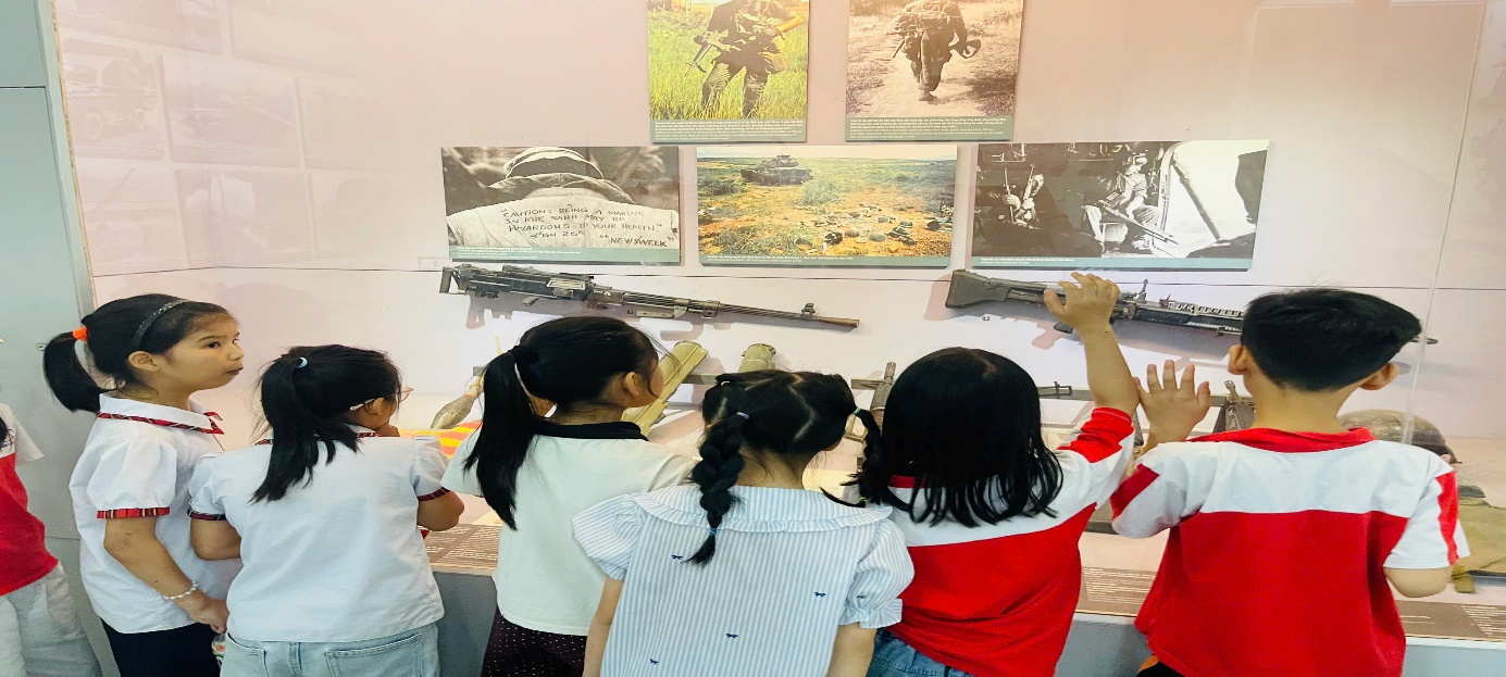 Các em được tận mắt quan sát nhiều hiện vật quý giá như: những chiếc xe vận tải, dụng cụ sinh hoạt, vũ khí, bản đồ tác chiến… cùng với hệ thống hình ảnh, tư liệu chân thực. Không chỉ dừng lại ở việc “xem” và “nghe”, nhiều em còn chủ động đặt câu hỏi, bày tỏ sự tò mò, thích thú và niềm tự hào về truyền thống vẻ vang của dân tộc. Hoạt động này đã góp phần bồi dưỡng lòng yêu nước, giúp các em hiểu rõ hơn về giá trị của hòa bình hôm nay.