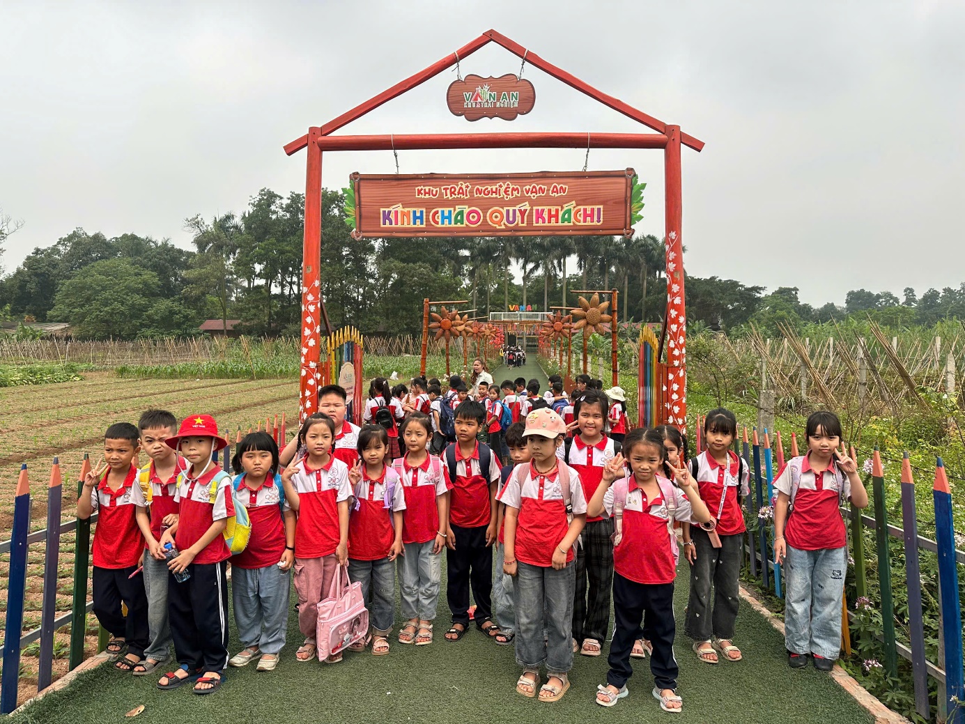 Rời không gian lịch sử trang nghiêm, các em tiếp tục hành trình trải nghiệm tại trang trại Vạn An – một không gian gần gũi với thiên nhiên, mang đậm màu sắc giáo dục thực tiễn. Tại đây, các em được tham gia nhiều hoạt động bổ ích như: tìm hiểu quy trình trồng và chăm sóc cây trồng, quan sát và tiếp xúc với các loại vật nuôi quen thuộc như gà, vịt, thỏ, dê…